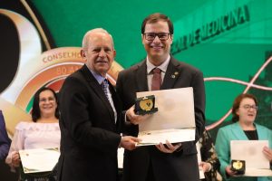 O Presidente do CREMERO, Dr.João Paulo Cuadal Soares, foi homenageado juntamente com os demais presidentes dos Conselhos Regionais de todo o país. Também foram reconhecidos os atuais conselheiros federais titulares e suplentes, representados na ocasião pelo Conselheiro do CREMERO, Dr. Cleiton Bach.